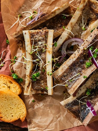 - 8 to 12 center-cut beef or veal marrow bones, about 4 pounds total, split